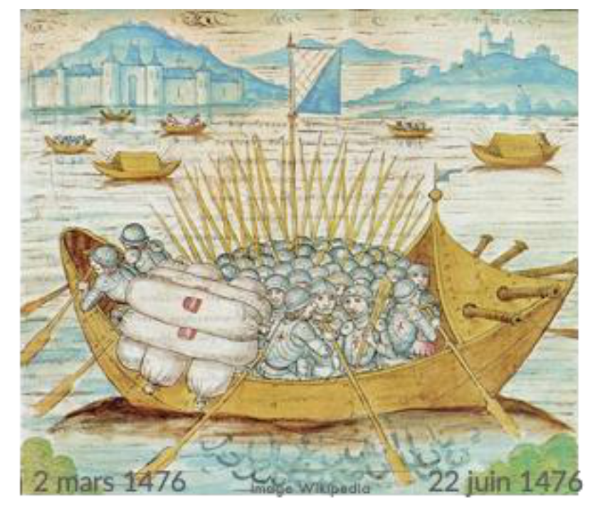 Il y a 550 ans, les confédérés ont affronté les armées de Charles le Téméraire lors des guerres de Bourgogne. En particulier, ils les ont battu à Grandson en mars 1476, puis ils ont défait le siège de Morat en juin 1476, grâce à l’aide des troupes des cantons suisses venues en renfort. De nombreuses informations sont disponibles sur le site https://www.grandsonmorat1476.ch